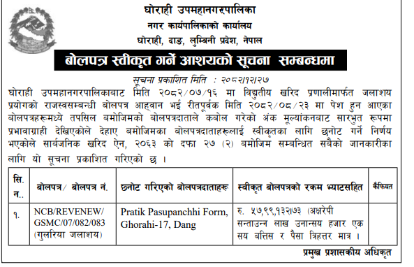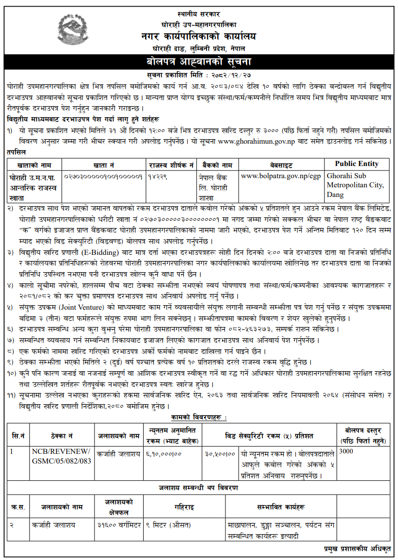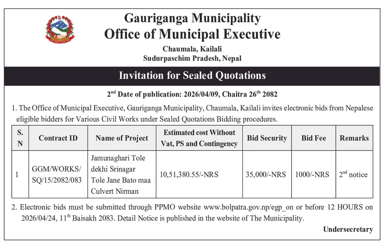 | 133 | Ghorahi Sub Metropolitian City, Dang | Oda No 1 Ghimirekuti Gaauma Jane Sotama Culvert Nirman | 09/04/2026 | PPMO | 24/04/2026 | Click Here | |