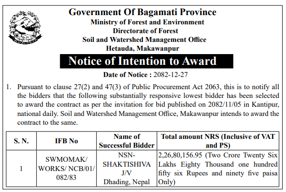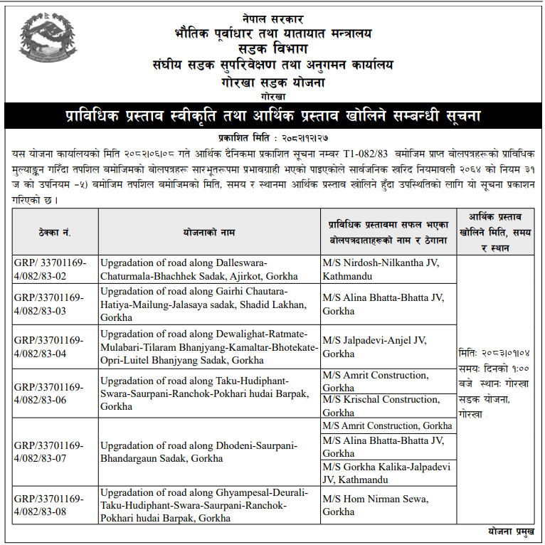 - Award Notice : Road Upgrading Work At Various Places (Swornikita Construction and Suppliers, Gatishil-Gravity JV) |