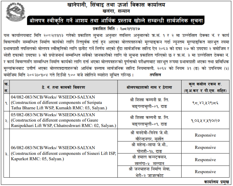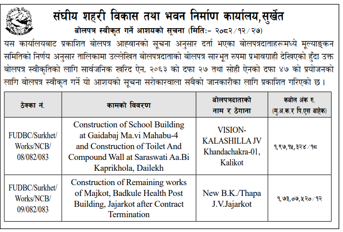 प्रदेश ७ मा प्रकाशित निर्माण सम्बन्धी बोलपत्र तथा आशयका सुचनाहरु