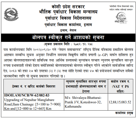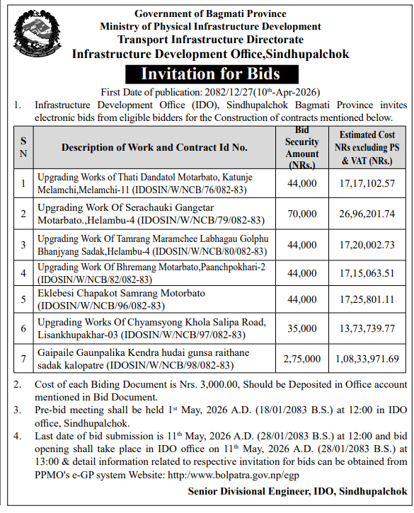 | 50 | Infrastructure Development Office,Illam | Upgrading of Khalange Uttare Ratuwakhola Kerabari Amale Road at Mangsebung 3 and 6, Ilam | 09/04/2026 | PPMO | 10/05/2026 | Click Here | |