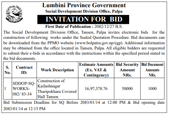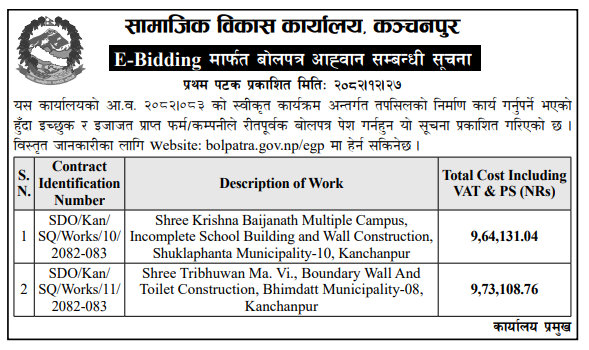 | 36 | Social Development Office, Kailali | Sabha Hall Nirman Gauriganga-01 Kailali | 09/04/2026 | PPMO | 11/05/2026 | Click Here | |