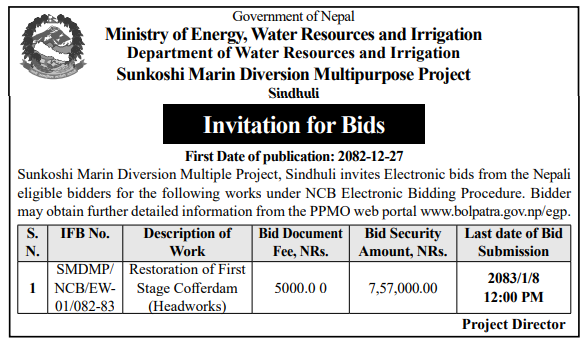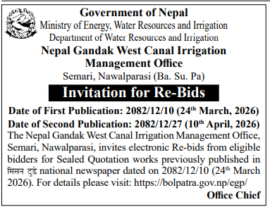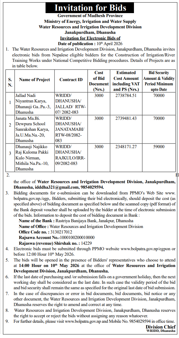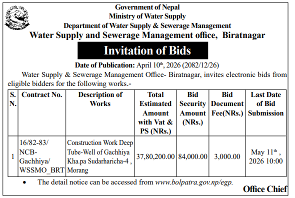 | 10 | Groundwater Resources and Irrigation Development Division, Birgunj | construction of 5 Nos.of 6 inch dia. Powerdrill Tuubewell by DTH method and Sumbersible Pump/motor Installation with accessories at Different locations of Thori Ga.Pa. -1 and 2,Parsa District | 09/04/2026 | PPMO | 11/05/2026 | Click Here | |