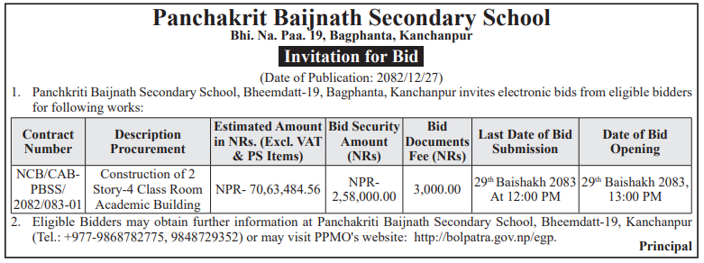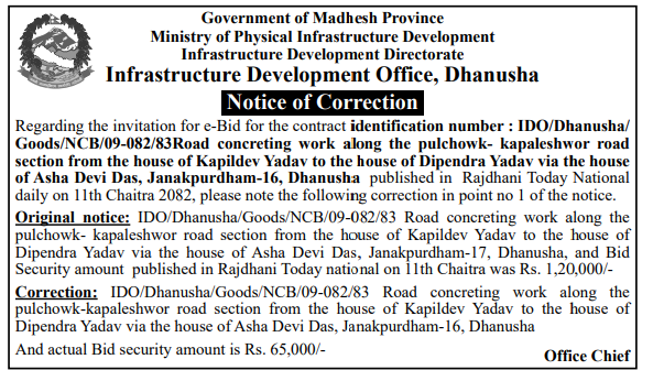 | 7 | Ganeshman Charnath Municipality Office, Madhesh Province, DHANUSA; | Construction of Incomplete School Building of Radhapur | 09/04/2026 | PPMO | 11/05/2026 | Click Here | |