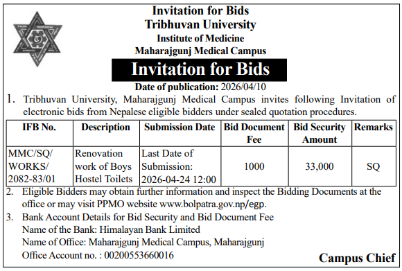 | 137 | Maharajgunj Medical Campus, Maharajgunj | Renovation work of Boys Hostel Toilets | 09/04/2026 | PPMO | 23/04/2026 | Click Here | |