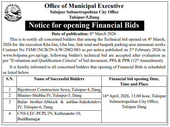 | 198 | Chulachuli Rural Municipality | Construction and Upgradation Works on Tulashi Marga, Kirat Chowk Marga and Shanti Marga North Road | 09/04/2026 | PPMO | 12/05/2026 | Click Here | |