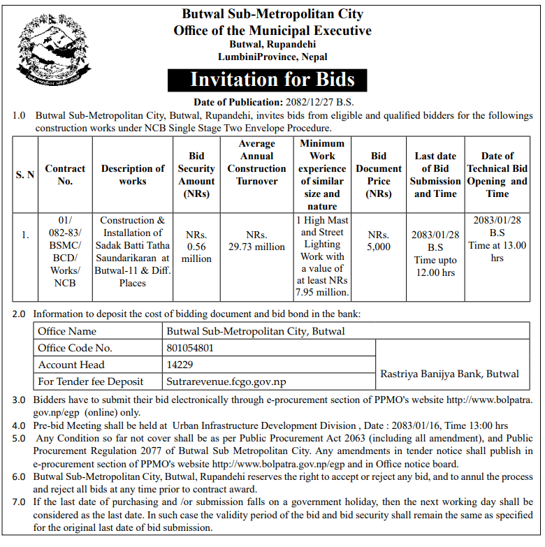 | 2 | Butwal Sub-Metropolitan City | GP Koirala Smriti Pratisthan Adhuro Bhawan Nirman and Compound Wall Construction Work, Butwal-12, Rupandehi | 09/04/2026 | PPMO | 11/05/2026 | Click Here | |