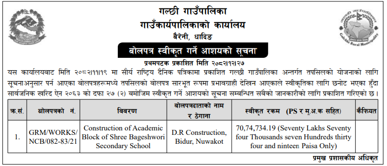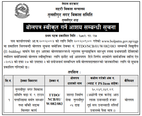 | 119 | Rurukshetra Rural Municipality | Gulmi Jilla Rurukshetra Basti Bikaska Laagi Sadak Purwadhar Nirman Karya Dayito Bhuktani Phase Two | 09/04/2026 | PPMO | 24/04/2026 | Click Here | |