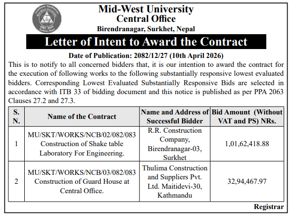 | 23 | Office of the Musikot Municipal Executive, Rukum (West) | Construction of Infrastructure at Digre Mandir (Parking Field) | 09/04/2026 | PPMO | 11/05/2026 | Click Here | |
