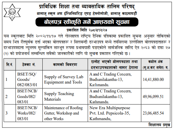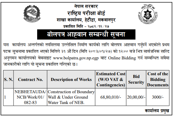| 146 | National Examinations Board , Madhyapur Thimi | Procurement of Laptop, Desktop Computer and Dot Matrix Printer National Competitive Bidding (NCB) IFB No.: NCB/NEB/3/2082/83 | 09/04/2026 | PPMO | 11/05/2026 | Click Here | |