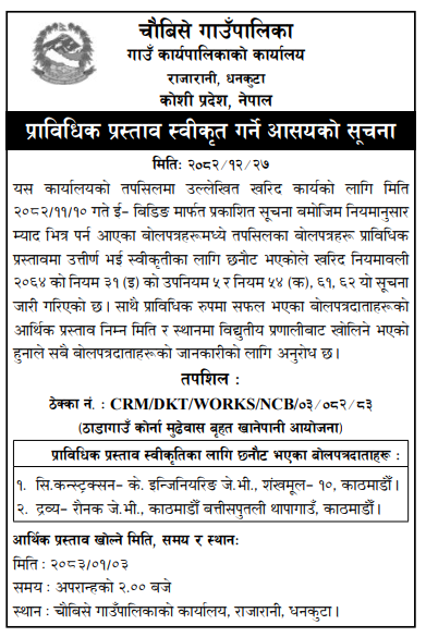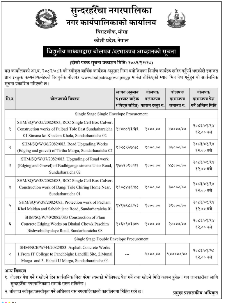 | 6 | Dharmadevi Municipality Office, Koshi Province, SANKHUWASABHA; | Wada no.1 Jimi Gaau Jane Bato | 09/04/2026 | PPMO | 11/05/2026 | Click Here | |
