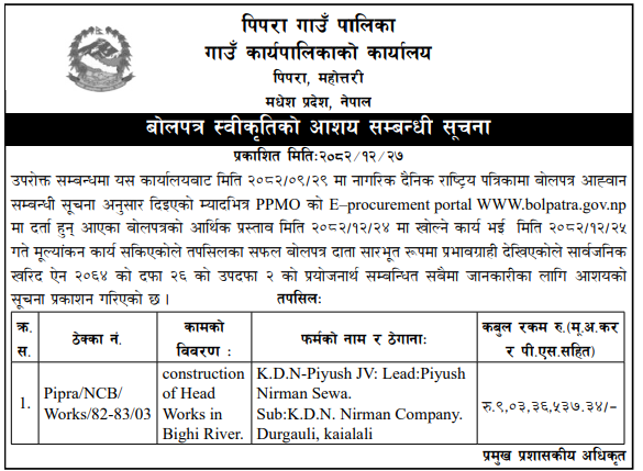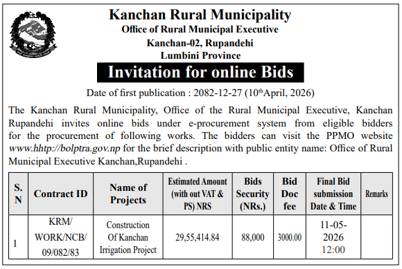 | 108 | Laxmipur Patari Rural Municipality | Construction Works | 09/04/2026 | PPMO | 24/04/2026 | Click Here | |