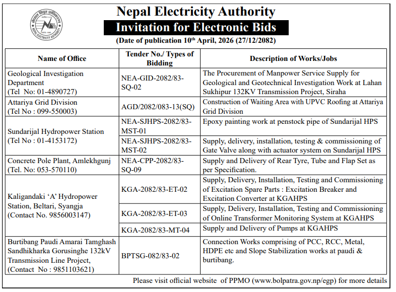 | 147 | NEA, Sunkoshi Hydropower Station | Supply,Delivery,Installation,Testing and Commissioning of ACSR Conductor,Insulators,Disconnecting Switch with necessary Clamps,related accessories and all related works at Switchyard at SHPS | 09/04/2026 | PPMO | 11/05/2026 | Click Here | |