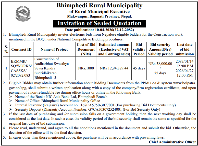 | 34 | Ramechhap Municipality Office, Bagmati Province, RAMECHHAP; | Construction of Adharbhut Health post at Thakledada | 09/04/2026 | PPMO | 11/05/2026 | Click Here | |