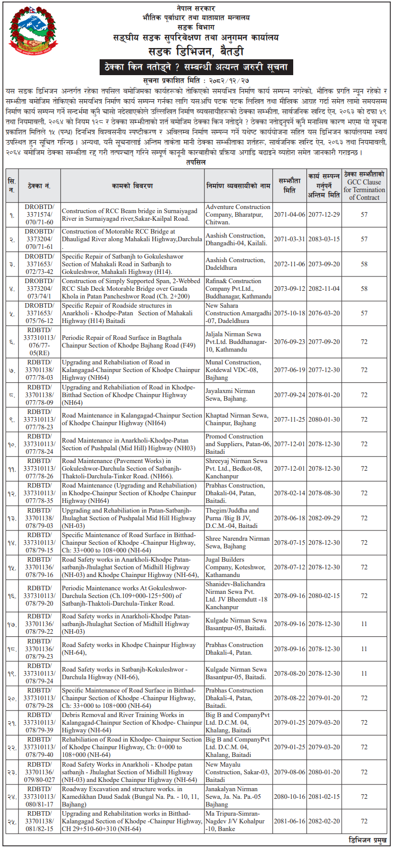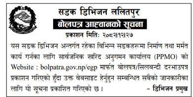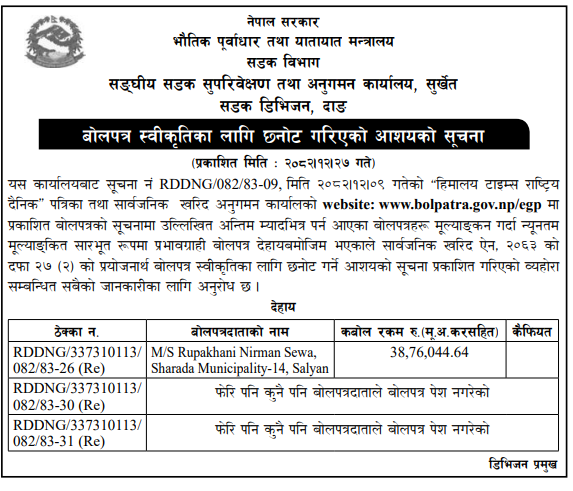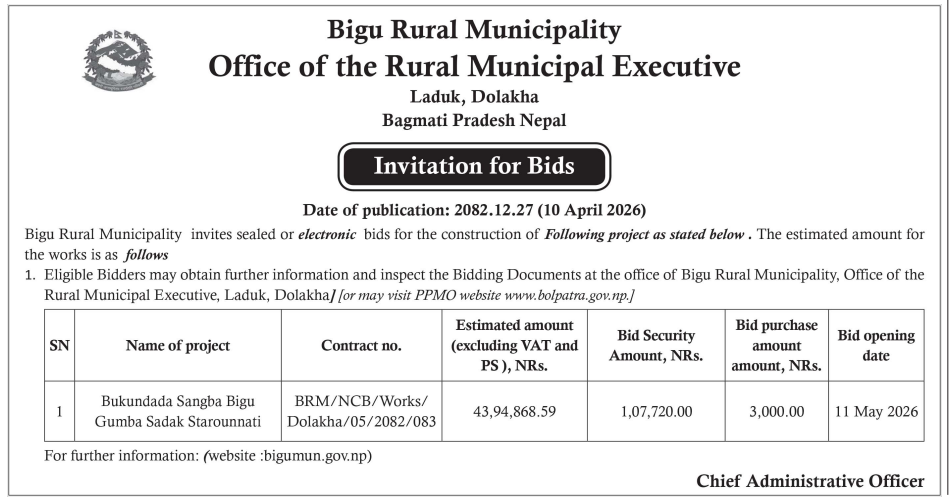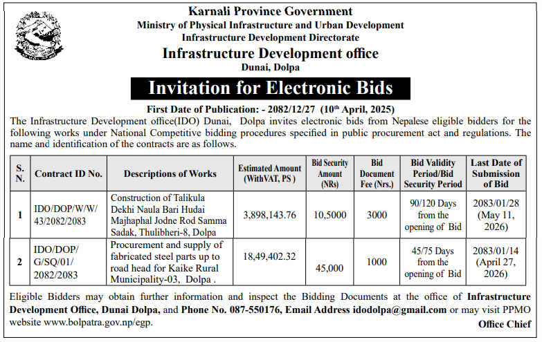 | 27 | Naugad Rural Municipality Office, Sudurpaschim Province, DARCHULA; | Construction of Kheda Dhuligada Egarbhage Road | 09/04/2026 | PPMO | 11/05/2026 | Click Here | |