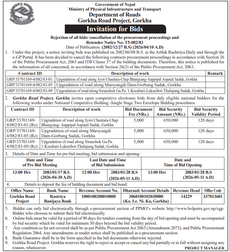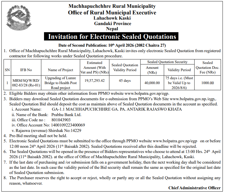 | 9 | Galyang Municipality Office, Gandaki Province, SYANGJA; | Road Maintenance Works (Sadak Board fy 082-083): Ward 3 Karyalaya dhekhi Chiuri-Basghari-Bhaykute Padhero Sadak | 09/04/2026 | PPMO | 11/05/2026 | Click Here | |