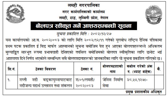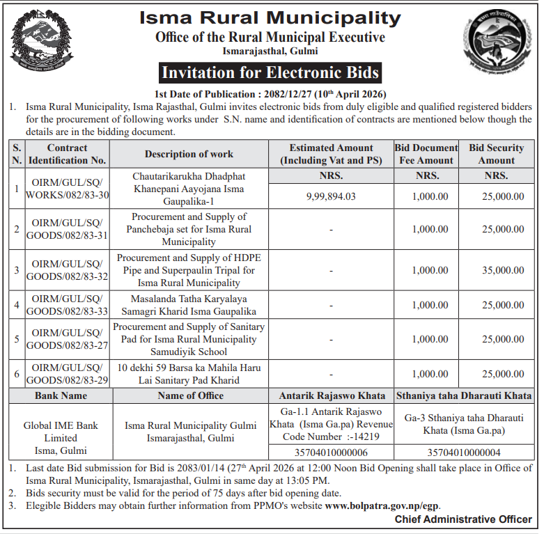 | 110 | Office of Musikot Municipality | Riverbed materials extraction work from Bhujel Bagar-2082-2083 | 09/04/2026 | PPMO | 24/04/2026 | Click Here | |