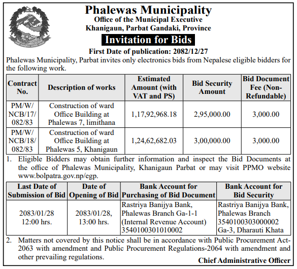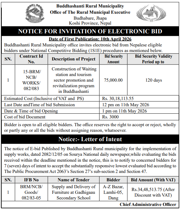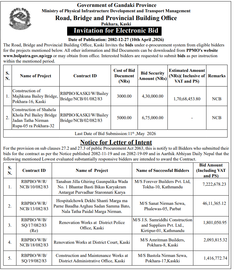 | 170 | Bheerkot Municipality | Procurement of Mauri Ghaar for Bheerkot Municipality | 09/04/2026 | PPMO | 24/04/2026 | Click Here | |