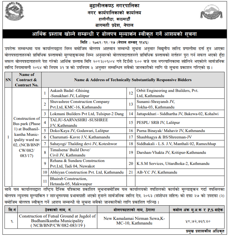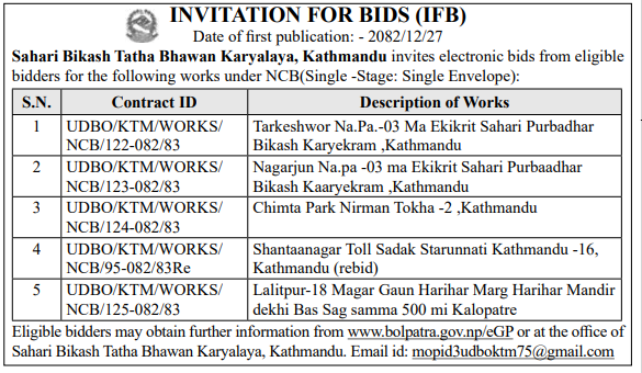 | 39 | Tarakeshwor Municipality | Construction Works of Kavresthali Pul Nirman Kathmandu Tarakeshwor Nagarpalika 2 | 09/04/2026 | PPMO | 11/05/2026 | Click Here | |
