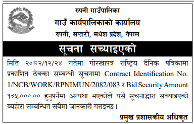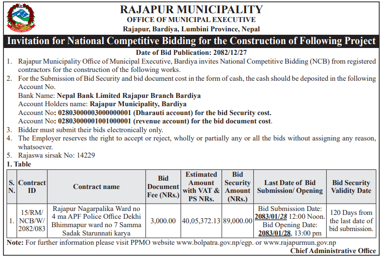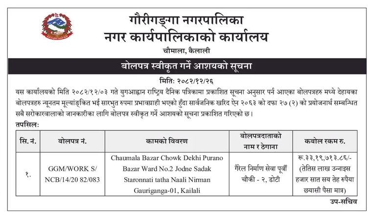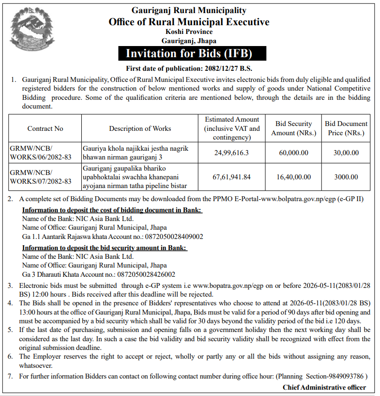 | 40 | Gaindakot Municipality, Office of Municipal Executive | Repair, Maintenance and Rennovation of Administrative Building Ground Floor and Premises Building after Gen Z Protest at Gaindakot Municipality, Ward No-5 | 09/04/2026 | PPMO | 10/05/2026 | Click Here | |