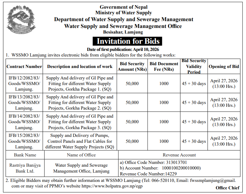 | 165 | Water Supply, Irrigation and Energy Development Office, Jajarkot | Procurement and delivery of HDPE pipe (NS-40, PE-100) in Khalanga, Jajarkot | 09/04/2026 | PPMO | 24/04/2026 | Click Here | |