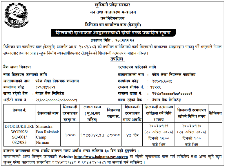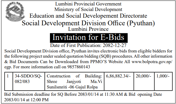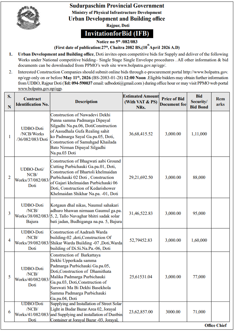 | 124 | Social Development Office, Doti | Adhuro Bhawan Nirman at Durga MaVi Joshigaun Purwichauki RM-3 Doti | 09/04/2026 | PPMO | 24/04/2026 | Click Here | |