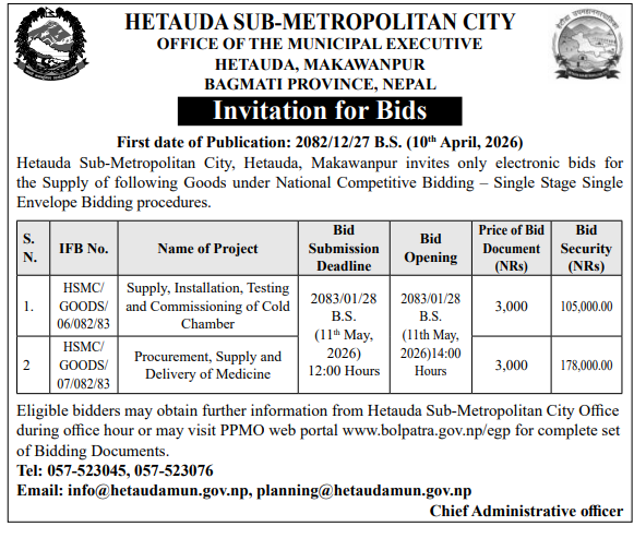 | 197 | Birgunj Metropolitan City | Supplying and delivering of Compact SUV as per attached Technical Specification | 09/04/2026 | PPMO | 17/04/2026 | Click Here | |