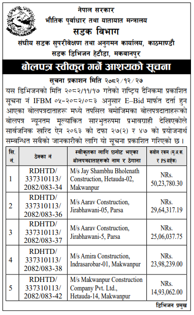 प्रदेश ३ मा प्रकाशित निर्माण सम्बन्धी बोलपत्र तथा आशयका सुचनाहरु