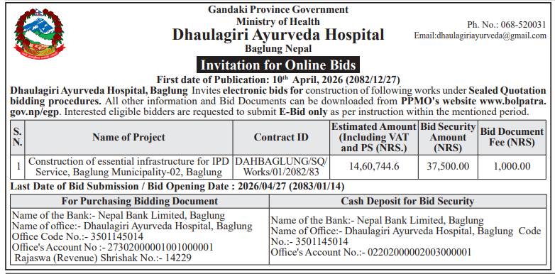 | 174 | Gajuri Rural Municipality, Dhading | Procurement of necessary medical supplies for Gajuri Primary Health Center | 09/04/2026 | PPMO | 24/04/2026 | Click Here | |