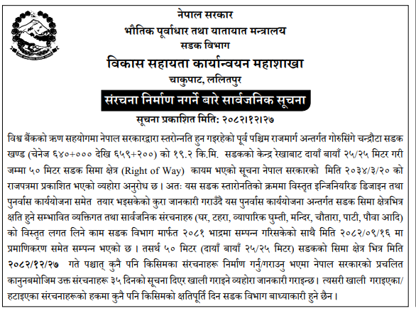 | 118 | Rurukshetra Rural Municipality | Bhanjyang Chimalpokhara Chimalpokhara Sadak Rurukshetra Gaunpalika -2, Gulmi Phase 2 | 09/04/2026 | PPMO | 24/04/2026 | Click Here | |