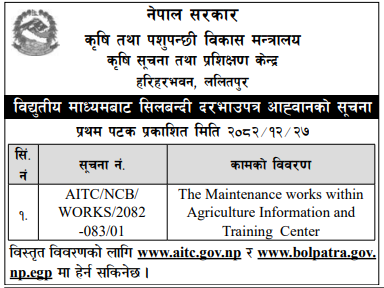| 20 | Mechanized Irrigation Innovation Project | Construction of Deep Tubewell, Pump house, Pump Installation and Electrification works for Conjunctive Use in Gadhimai-04, Rautahat District | 09/04/2026 | PPMO | 11/05/2026 | Click Here | |