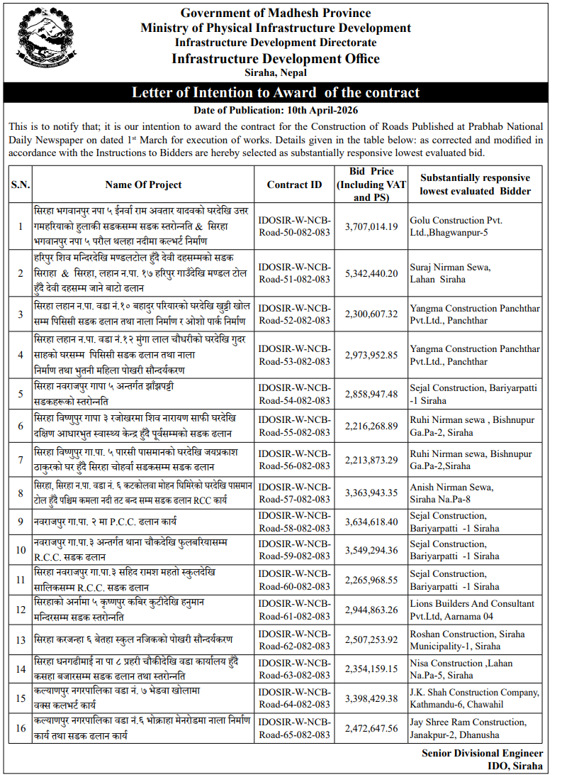 | 15 | Infrastructure Development Office, Parsa | Construction of Road at Bahudarmai-3 Gamhira Sah Farm to Samasanghat | 09/04/2026 | PPMO | 11/05/2026 | Click Here | |