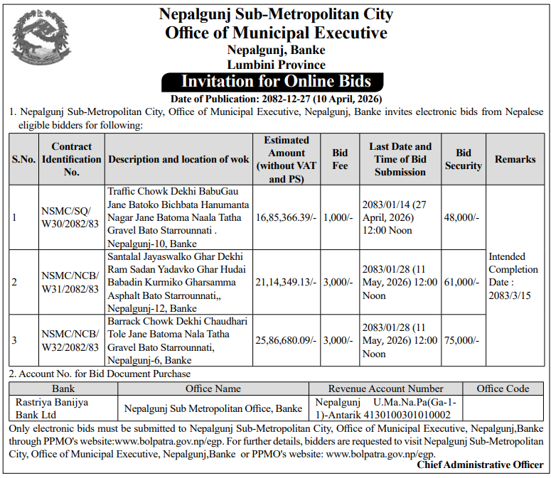 | 120 | Infrastructure Development Office, Banke | Construction of two Roads : (1)Asphalt Concrete work at Raptisonari 9 Ring Road (2) Asphalt Concrete work at Janata Mabi dekhi Bucchapur Pacchim Road,Raptisonari 9 Banke | 09/04/2026 | PPMO | 24/04/2026 | Click Here | |