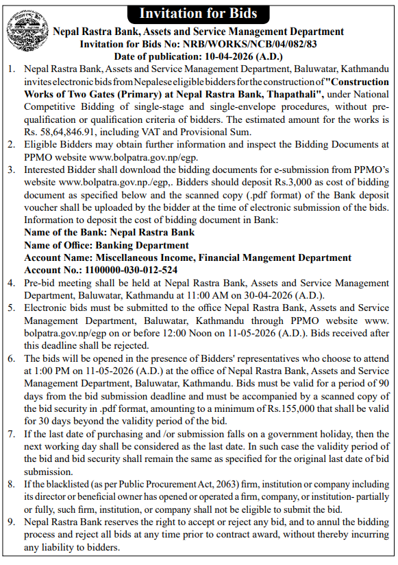 | 26 | NEA, Lumbini Province Division Office | Procurement for construction of store room and other miscellaneous civil works | 09/04/2026 | PPMO | 11/05/2026 | Click Here | |