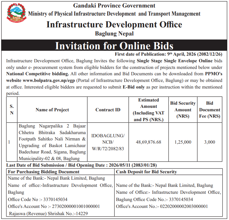 | 46 | Infrastructure Development Office, Baglung | Baglung Nagarpalika 2 Bajaar Chhetra Bhitraka Sadakharuma Footpath Sahitko Nali Nirman & Upgrading of Baskot Lamichaur Badechaur Road , Sigana, Baglung Municipality-02 & 08, Baglung | 09/04/2026 | PPMO | 10/05/2026 | Click Here | |