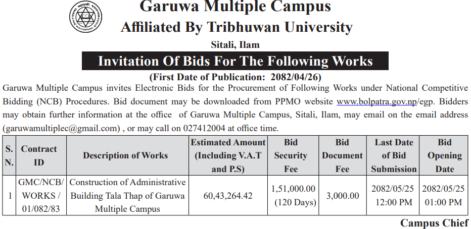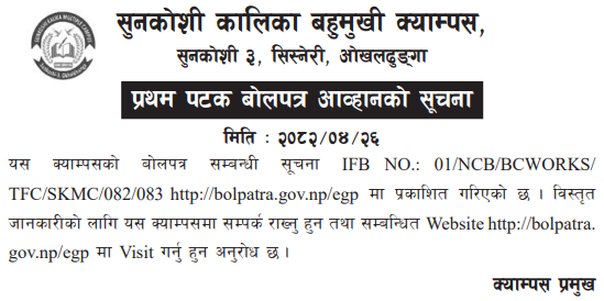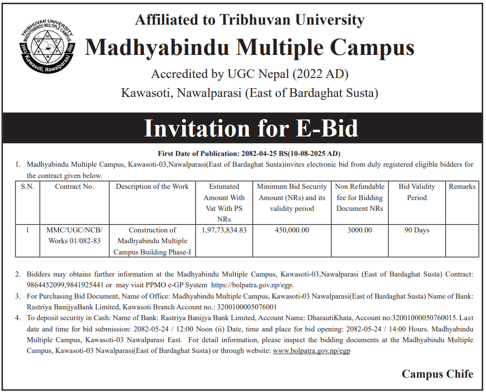 | 6 | Madhyabindu Multiple Campus, Kawasoti, Nawalparasi | Construction Of Madhyabindu Multiple Campus Phase-I | 10/08/2025 | PPMO | 09/09/2025 | Click Here | |
