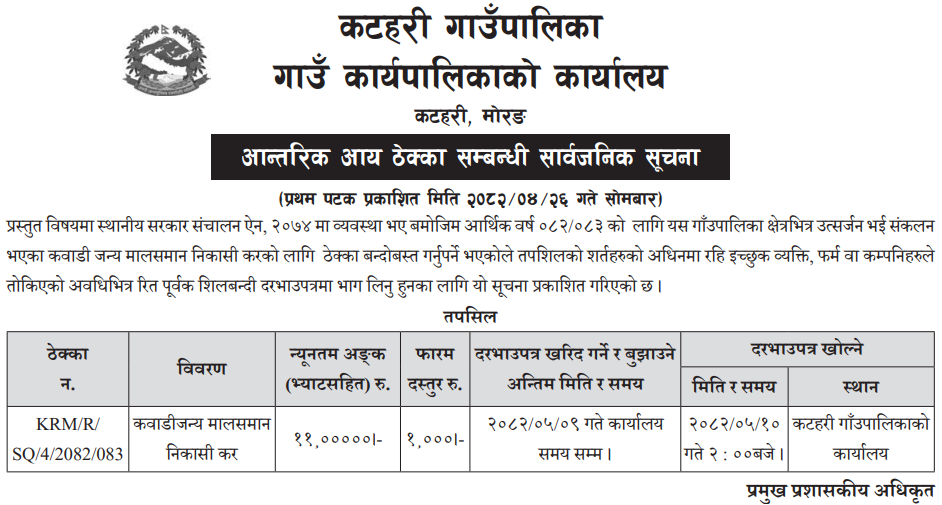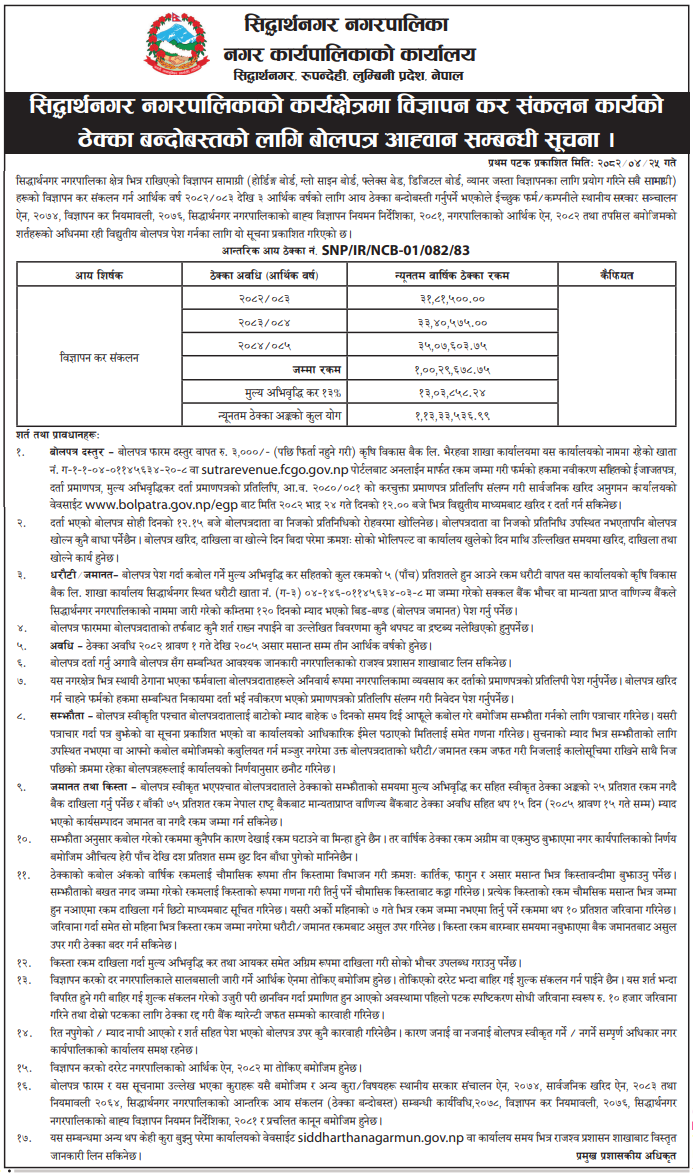 | 18 | Shadananda Municipality, Bhojpur | Collection of Advertisement Tax of Siddharthanagar Municipality. | 10/08/2025 | PPMO | 09/09/2025 | Click Here | |