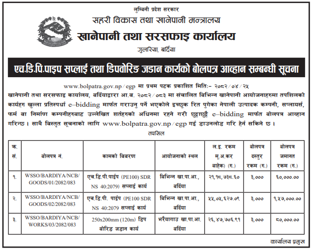 | 20 | WSSO Bardiya | Supply and Delievery of HDPE Pipes | 10/08/2025 | PPMO | 09/09/2025 | Click Here | |