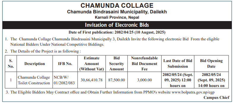 | 8 | Chamunda College, Bindrasaini, Dailekh | Chamunda Collage Toilet Construction Chamunda Bindrasaini Municipality 3, Dailekh | 10/08/2025 | PPMO | 09/09/2025 | Click Here | |