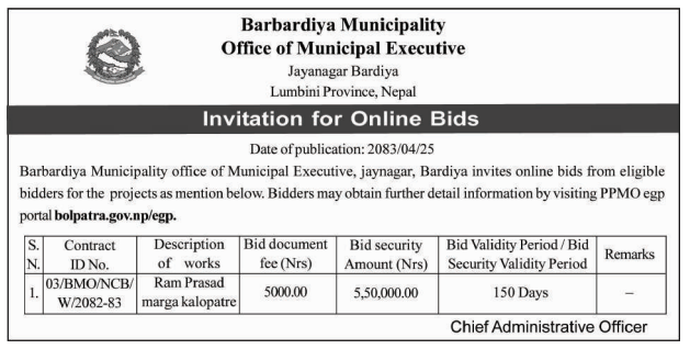 | 1 | Barbardiya Municipality | ramprasad marga kalopatrey | 10/08/2025 | PPMO | 09/09/2025 | Click Here | |