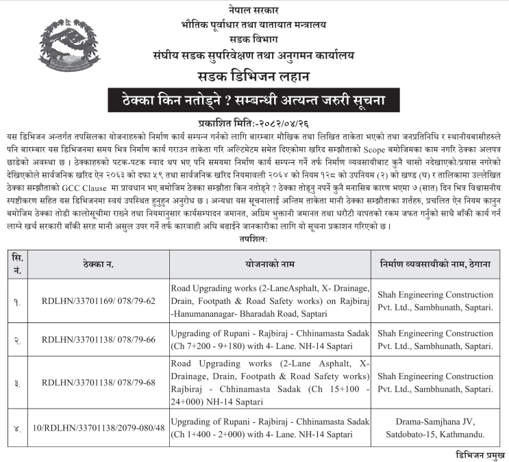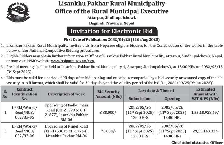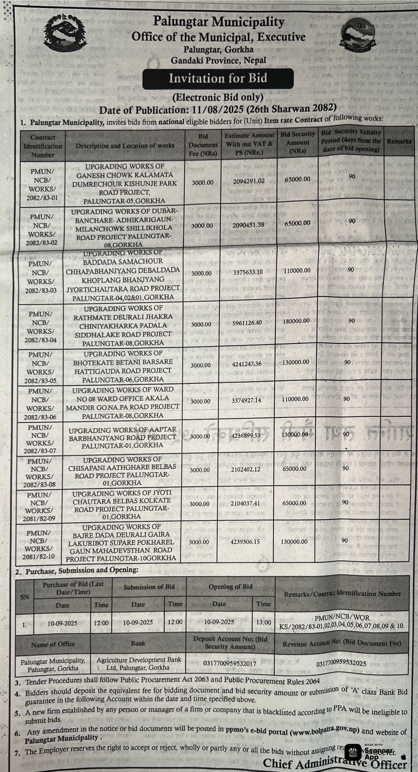 | 7 | Mahashila Rural Municipality, Parbat | Upgrading Of Aguwa-Hosrsangdhi-Gadi-Jampur-Subhadrikharka Road | 10/08/2025 | PPMO | 09/09/2025 | Click Here | |