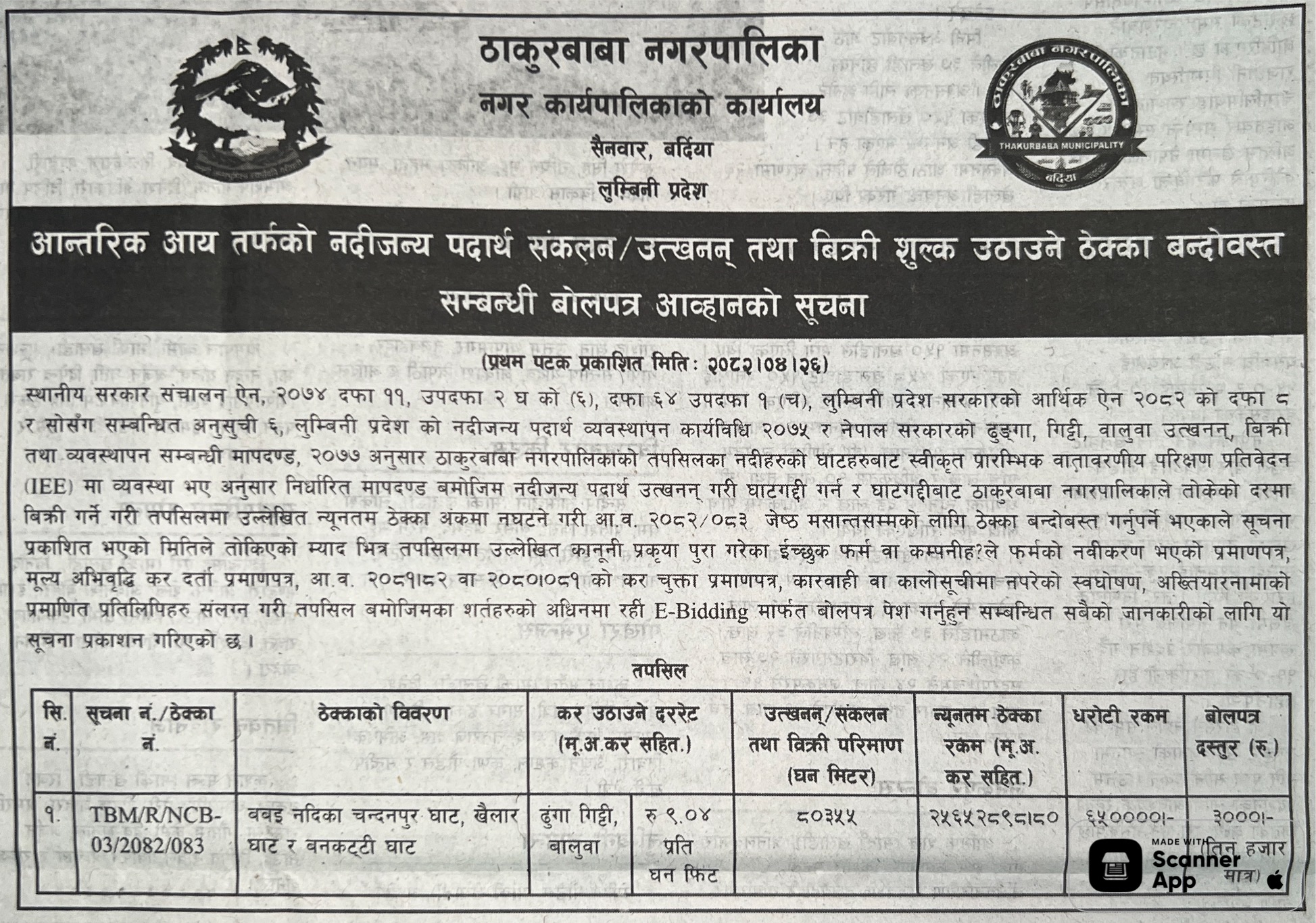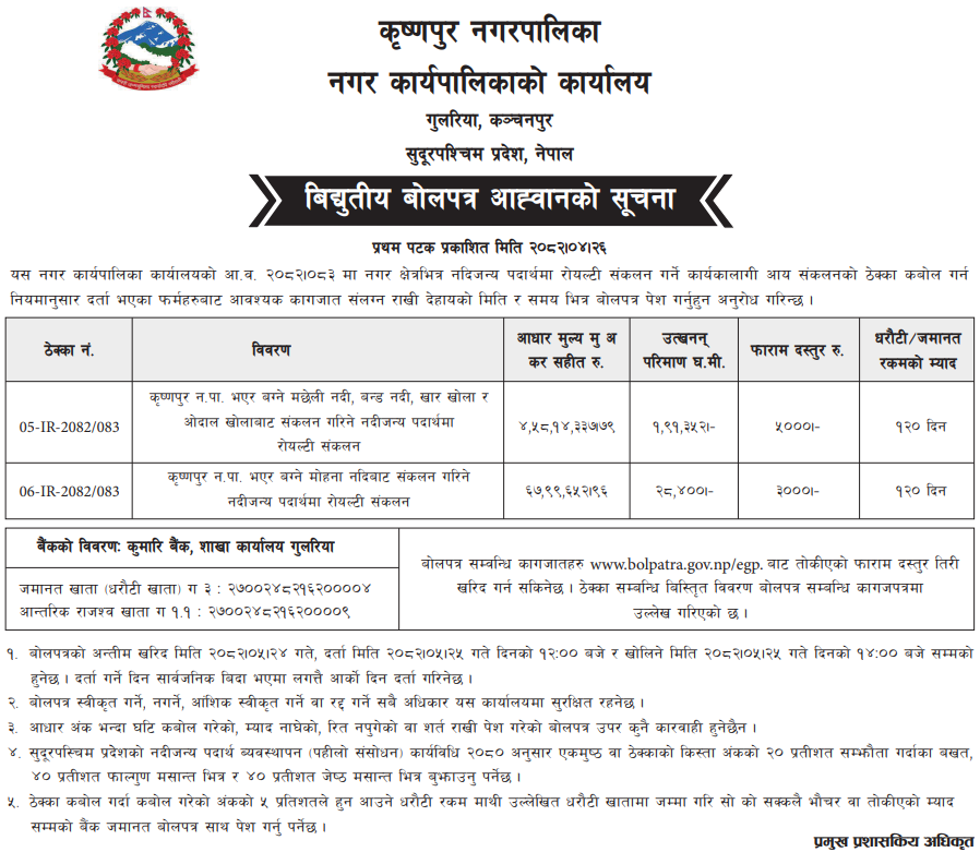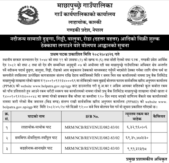 | 4 | Ganeshman Charnath Municipality | Sustainable Collection/Extraction of River bed Materials such as Stone, Gravel and Sand from charnath & Baluwa Khola | 10/08/2025 | PPMO | 09/09/2025 | Click Here | |