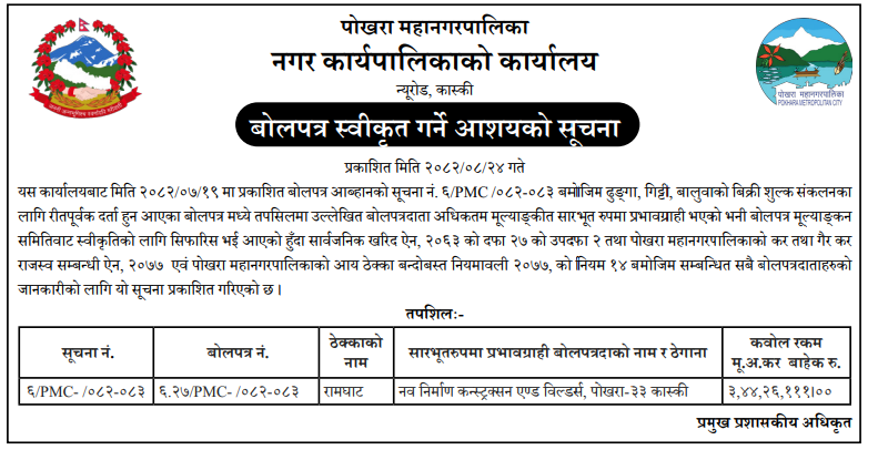 प्रदेश ४ मा प्रकाशित निर्माण सम्बन्धी बोलपत्र तथा आशयका सुचनाहरु
