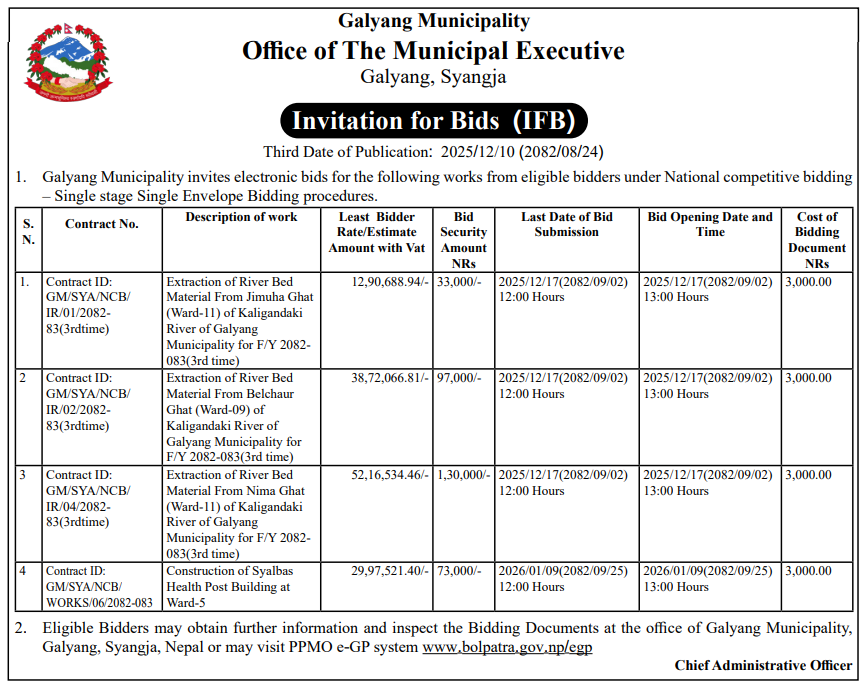 | 24 | Galyang Municipality | Extraction of River Bed Material From Jimuha Ghat (Ward-11) of Kaligandaki River of Galyang Municipality for f/y 2082-083 (3rd Time) | 10/12/2025 | PPMO | 17/12/2025 | Click Here | |