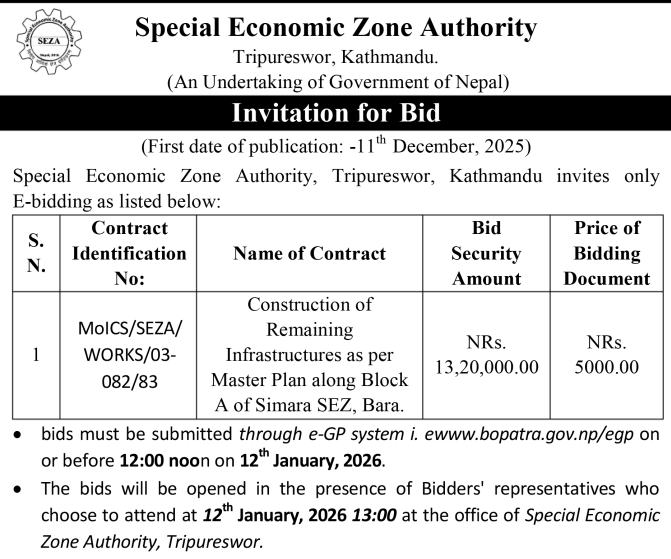 | 113 | Infrastructure Development Office Chitwan | Construction/Upgrading of Five different roads in Ratnanagar Municipality ward no. 05 and 06 under package -24 | 10/12/2025 | PPMO | 09/01/2026 | Click Here | |