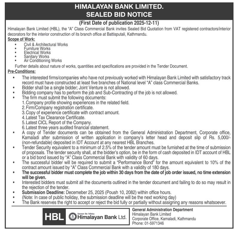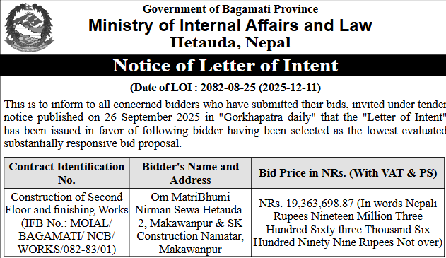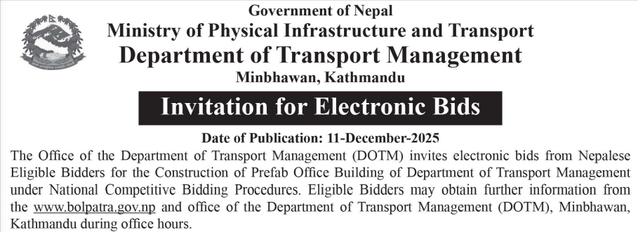 निर्माण सम्बन्धी प्रकाशित सम्पूर्ण ठेक्का टेन्डर तथा बोलपत्र सुचनाहरु प्रदेश अनुसार 11/12/2025 (Thursday)