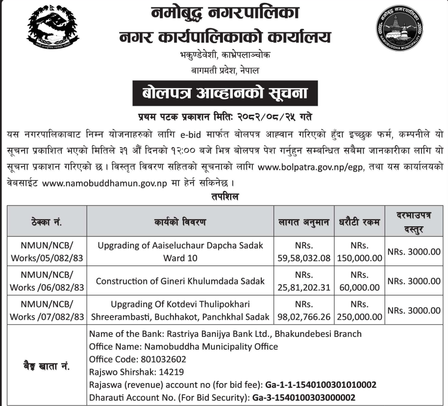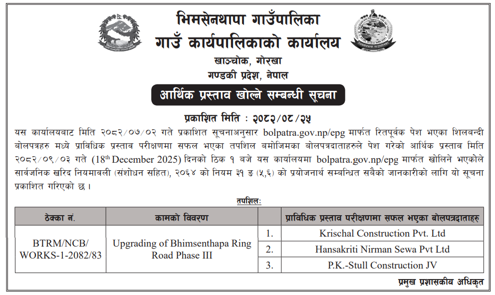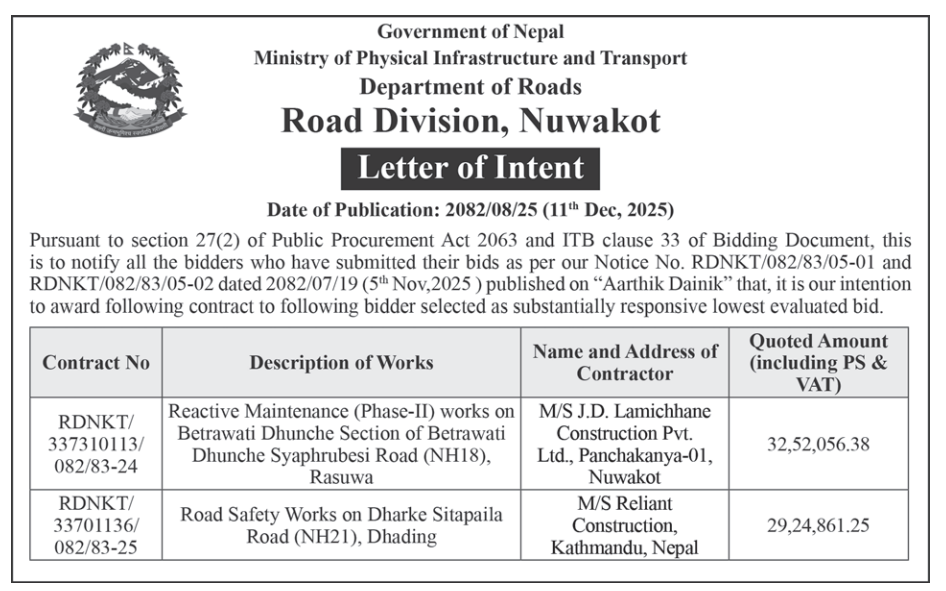 | 12 | Bidur Municipality,Nuwakot | Kutiko Chautaaro dekhi Krishna Mandir jodne Sadak Staronnati | 10/12/2025 | PPMO | 25/12/2025 | Click Here | |