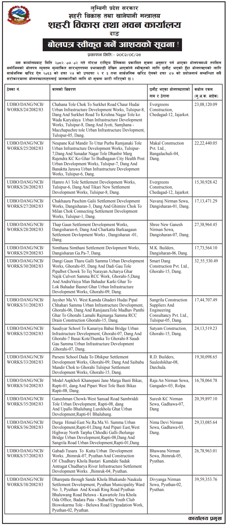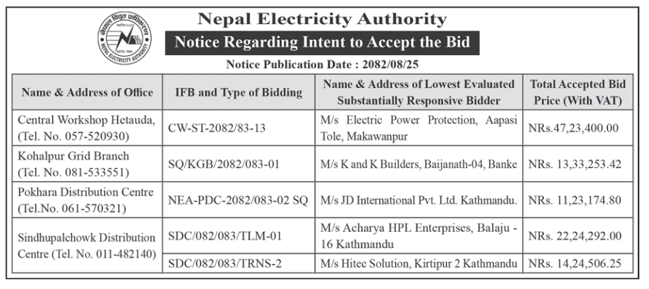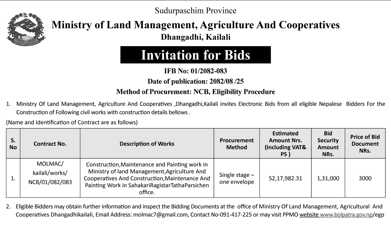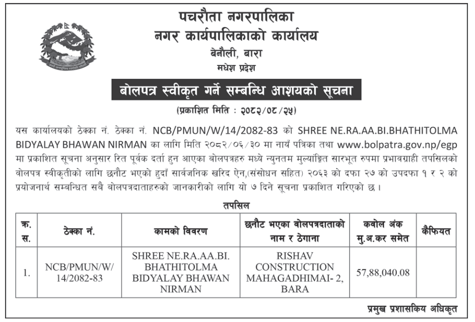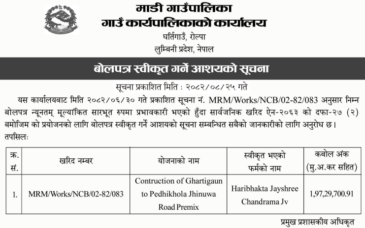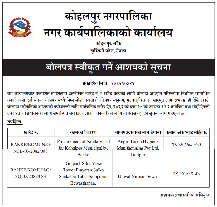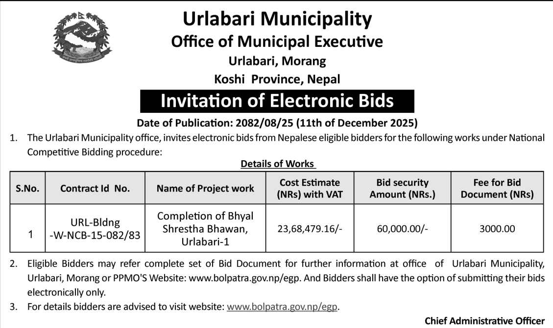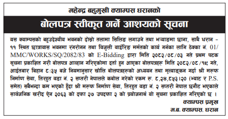 | 8 | Sundarharaicha Municipality | Ground Floor Repair and Maintenance of Municipality New Administrative Office Building | 10/12/2025 | PPMO | 26/12/2025 | Click Here | |
