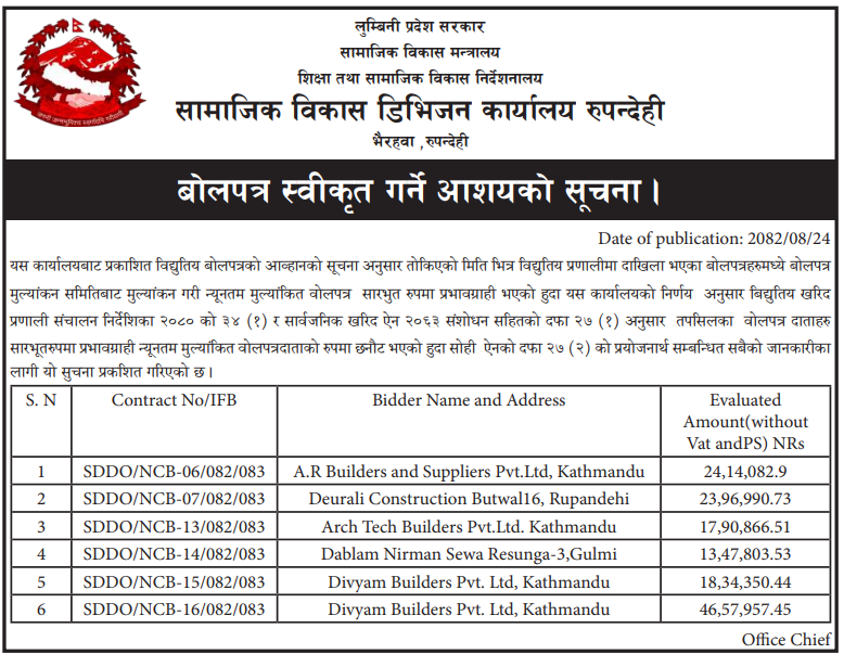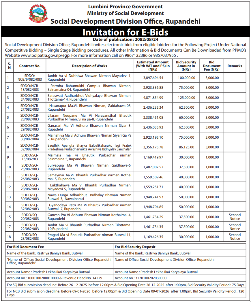 | 4 | Samajik Bikash Division Office,Rupandehi | Nawa Durga Aadharbhut Bidhyalaya Bhawan Nirman, Sunwal-3, Nawalparasi | 10/12/2025 | PPMO | 26/12/2025 | Click Here | |