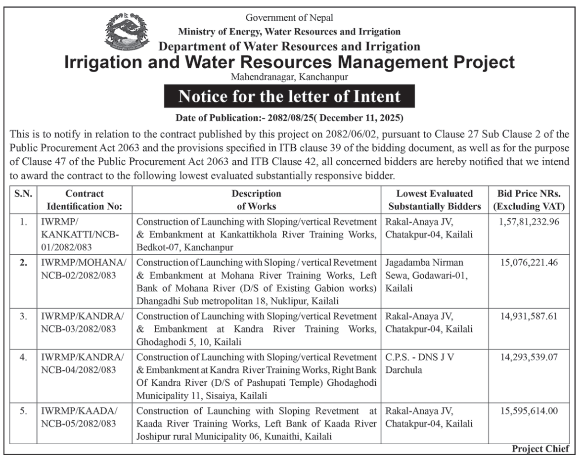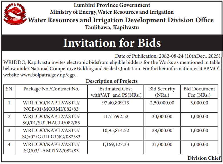 | 11 | Water resources and Irrigation Development Division Kapilvastu | Construction of Canal and associated Structures of Lamtiya Irrigation Project, Kapilvastu-2, Kapilvastu | 10/12/2025 | PPMO | 26/12/2025 | Click Here | |