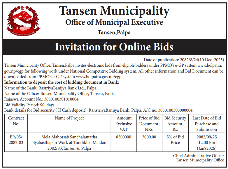 | 21 | Tilottama Municipality Office, Rupandehi | Apuro Compound wall, sava Hall tatha Ward karyalayma Purwadhar Nirman Byawasthapan, Tilottama-08, Rupandehi | 10/12/2025 | PPMO | 25/12/2025 | Click Here | |